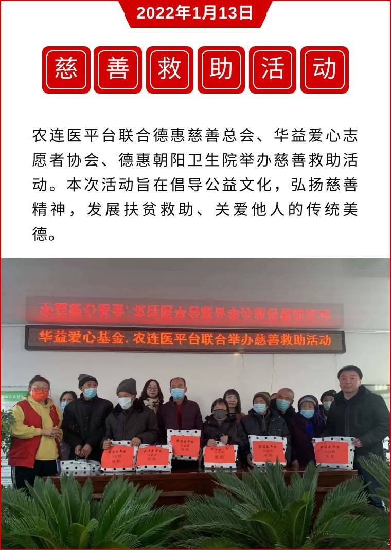 寒冬送温暖,农连医平台2022年首次公益活动,走进德惠朝阳卫生院,为朝阳乡近百名贫困户送衣物,送去温暖。