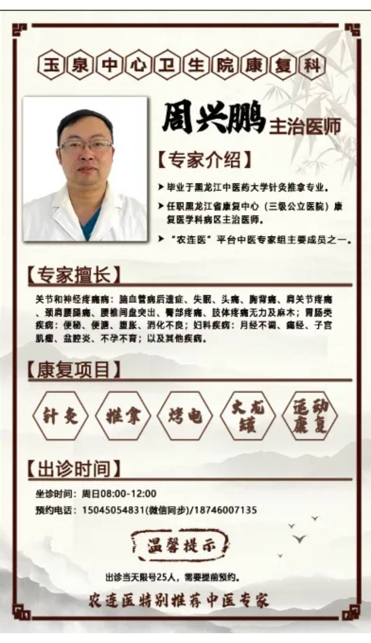 康复科出诊医生是农连医平台推荐的哈尔滨中医专家组成员,同时任职黑龙江省康复中心(三甲医院)康复医学科病区主治医生周兴鹏医生。