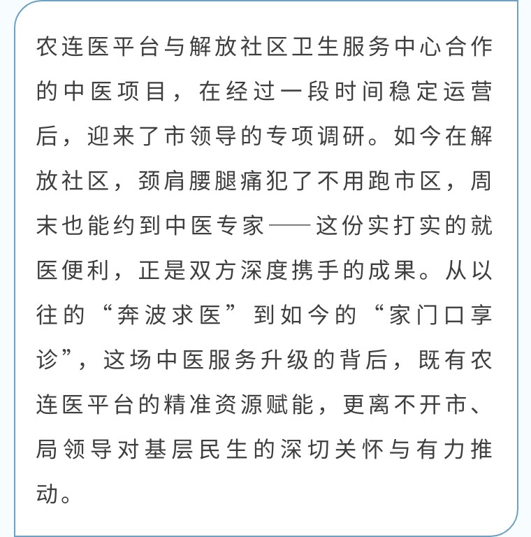 有市领导的政策指引与肯定,有农连医平台与解放社区卫生服务中心的携手深耕,更有中医团队的专业坚守,社区卫生服务中心中医服务正从“基础保障”向“品质服务”稳步跨越。未来,农连医平台将积极响应医共体建设号召,延续“简便验廉”的服务优势,在人才对接、资源整合上持续加力,引入更多中医特色服务、升级智能诊疗模式,让每一位居民,都能在家门口享受到省心、放心的优质中医服务,让健康常伴左右。