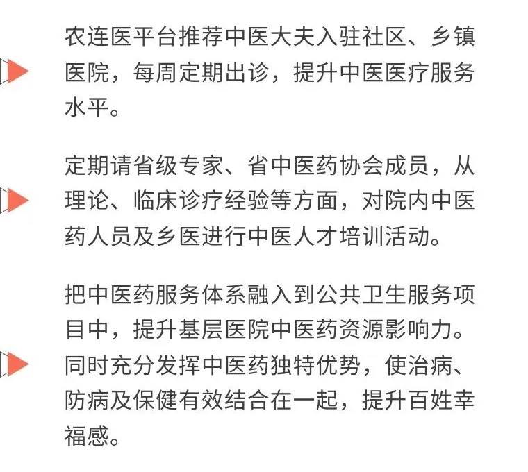农连医平台为患者、基层公立医院、有资质的中医大夫,搭接起患者在线诊疗、预约挂号、慢病健康管理、及医生资源对接基层公立医院等医疗互联网服务。实现“农医互联、连医助农”,专注于解决患者看病难、农村医疗资源短缺问题。