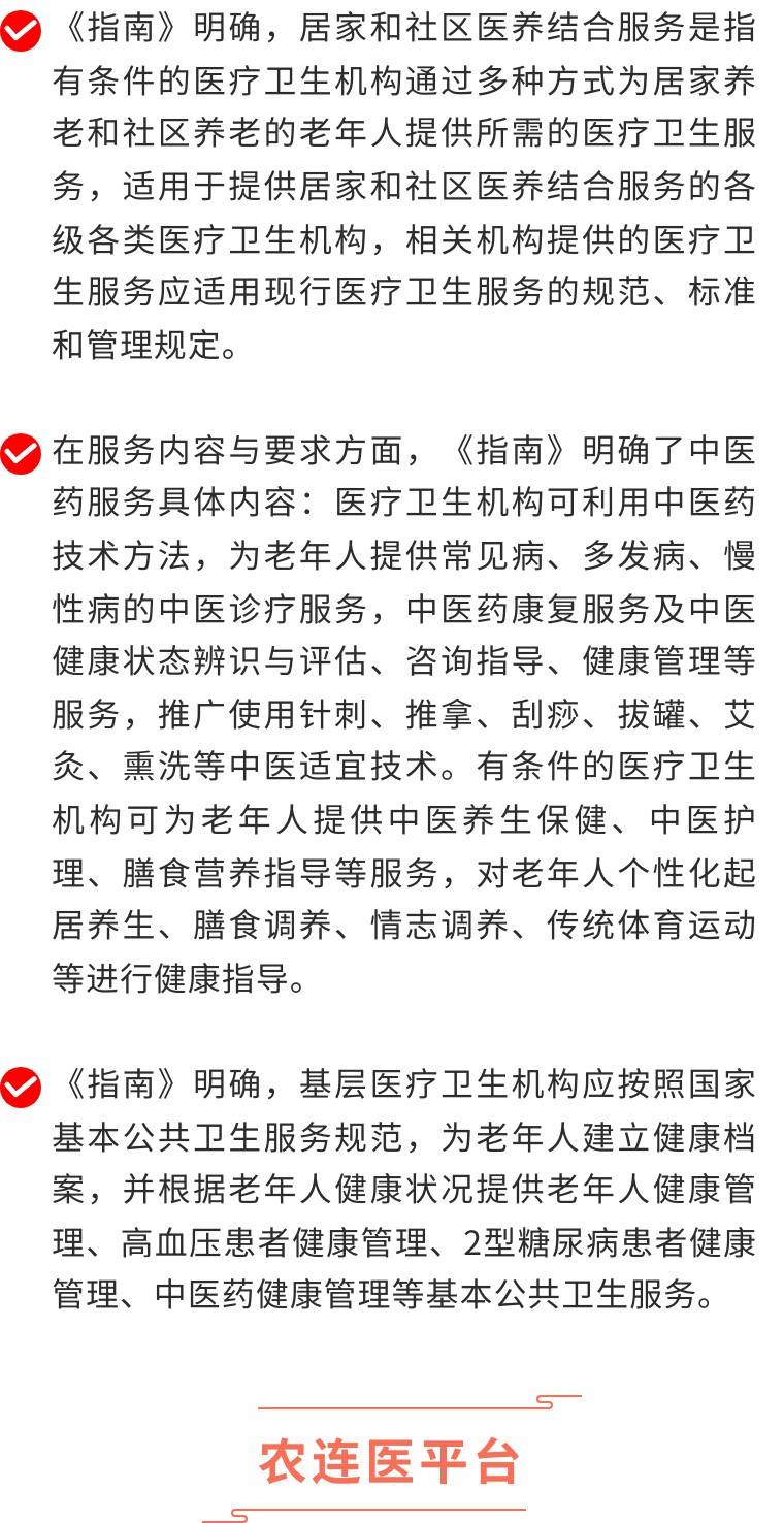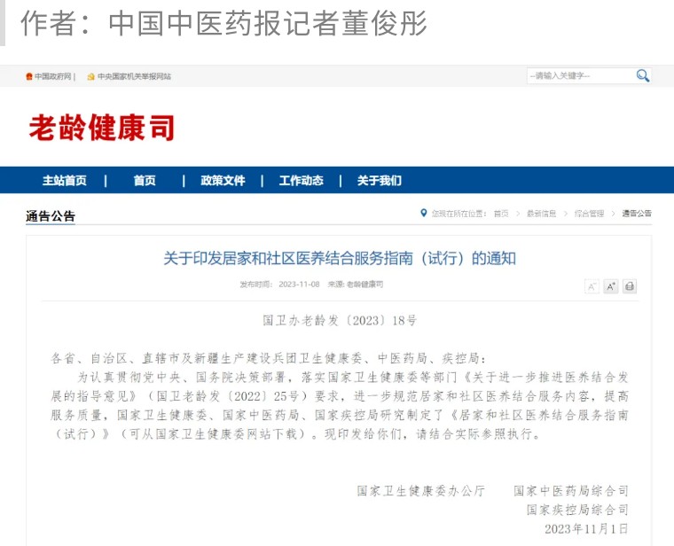 近日,国家卫生健康委办公厅、国家中医药局综合司、国家疾控局综合司联合印发《居家和社区医养结合服务指南(试行)》,对居家和社区医养结合服务的总则、基本要求、服务内容与要求、服务流程与要求等4方面作出了明确规范。